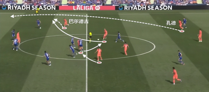 弗里克的巴萨,在中圈倒球的质量挺高的,关键是边路拿球之后,边后卫套上会非常快。所以弗里克对孔德要求,就是不断地上下跑动。